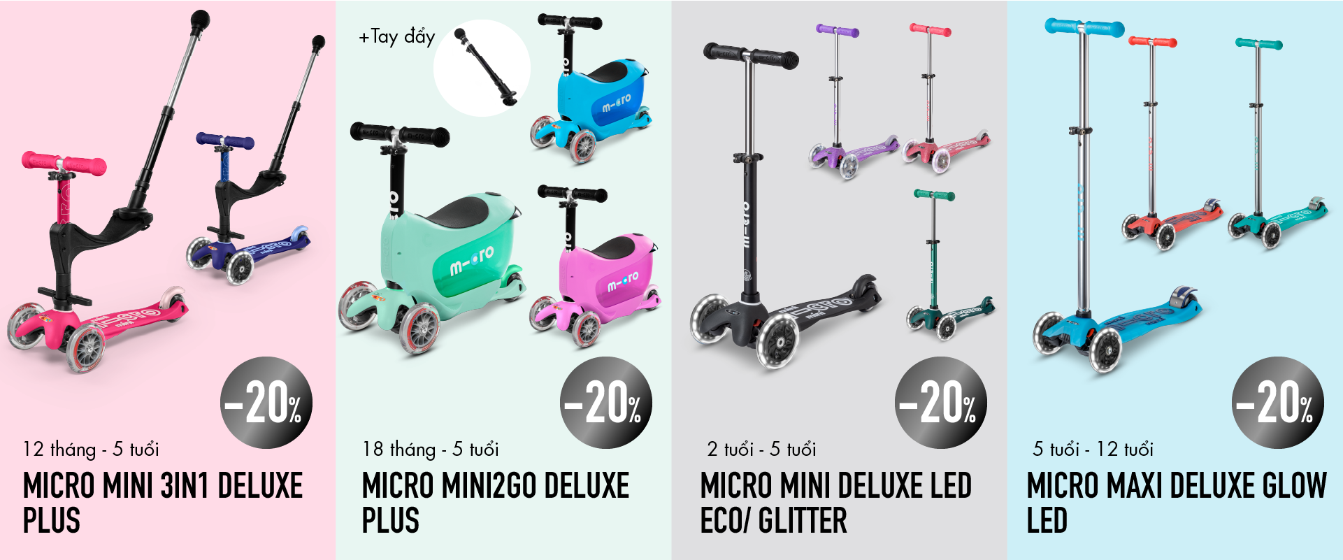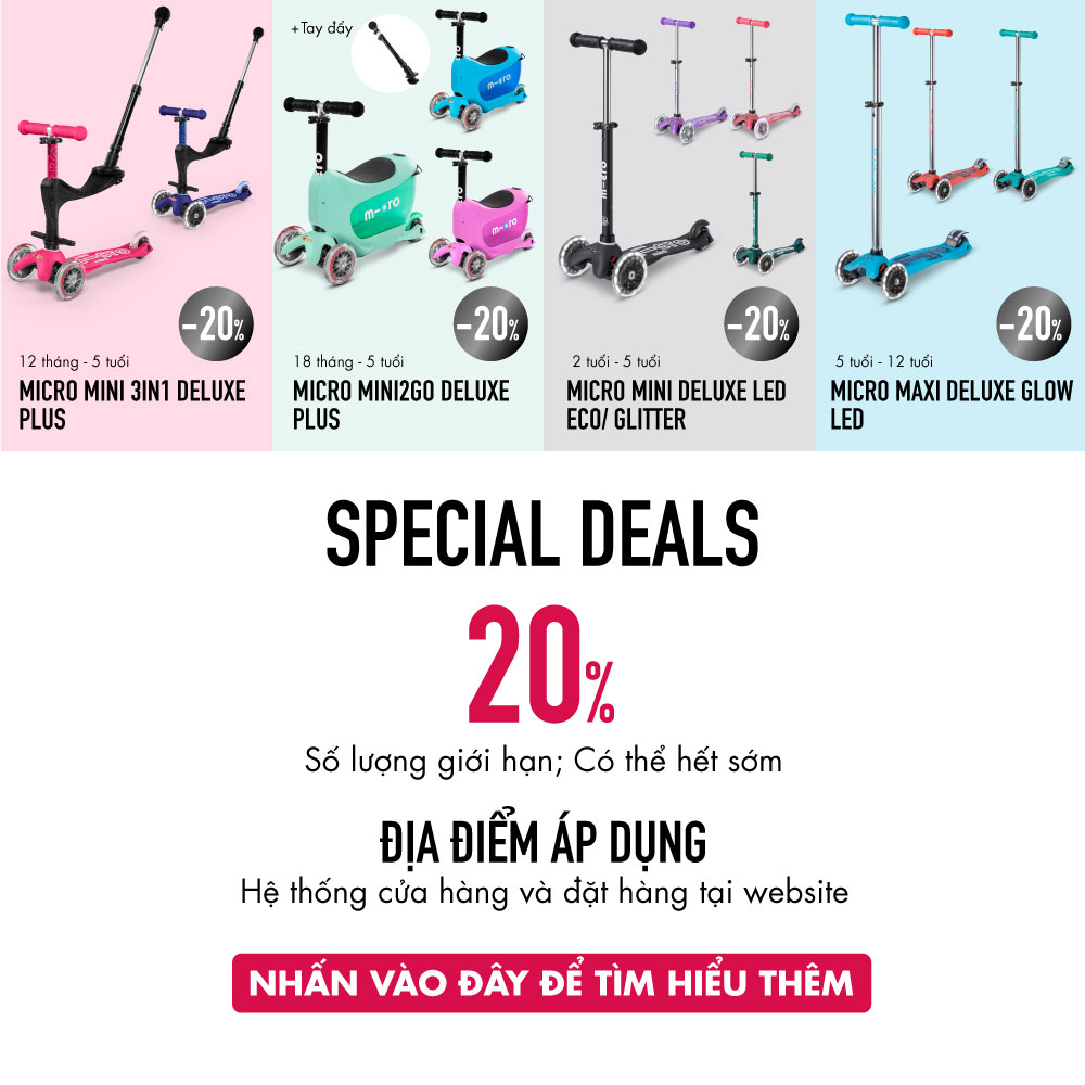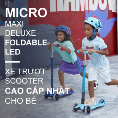 Micro Mini Deluxe Foldable LED là dòng xe trượt scooter nổi tiếng và bán chạy nhất trên toàn cầu dành cho trẻ nhỏ. Xe trượt scooter Micro Mini Deluxe không chỉ khuyến khích vận động mà còn giúp trẻ rèn luyện kỹ năng giữ cân bằng, điều phối. Sản phẩm được nghiên cứu và phát triển dưới sự tư vấn của bộ y tế Thuỵ Sĩ. Đây là một món đồ chơi thể thao, một phương tiện di chuyển hay một người bạn đồng hành không thể thiếu cho một lối sống Xanh, Năng động và Khoẻ mạnh. Cơ chế độc quyền "Nghiêng và Lái" được cấp bằng sáng chế và bàn để chân được gia cố bằng sợi thuỷ tinh. Các cạnh xe được bo tròn và phần tay nắm bằng nhựa mềm giúp trẻ điều khiển dễ dàng. Bánh xe PU cao cấp không phát ra tiếng ồn và không gây trầy xước sàn nhà trong suốt quá trình sử dụng. Công nghệ và kỹ thuật tiên tiến đến từ Thuỵ Sĩ của xe trượt Micro Mini Deluxe giúp mang đến những trải nghiệm bền bỉ, mượt mà và ổn định. Phiên bản Micro Mini Deluxe Foldable LED có bánh xe đèn LED và có thể gập lại dễ dàng chỉ với một thao tác bấm nút! Thông số kỹ thuật: Độ tuổi sử dụng: 2 – 5 tuổi Tải trọng tối đa: 50kg Trọng lượng xe: 1,9kg Chiều cao xe: 48cm – 67cm Dịch vụ sau mua hàng: Bảo hành 02 năm với lỗi từ Nhà sản xuất Hỗ trợ tư vấn kỹ thuật trong suốt quá trình sử dụng Cung cấp linh kiện chính hãng khi xảy ra hao mònXe đẩy gấp gọn Micro Trike Baby Cruiser 360 Khám phá thế giới qua mọi góc nhìn!