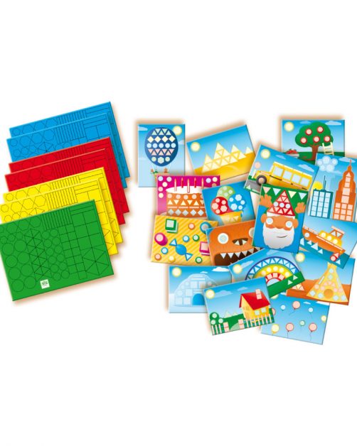 7 sheets with stickers in different shapes and colours: square, strip, circle, triangle and hexagon