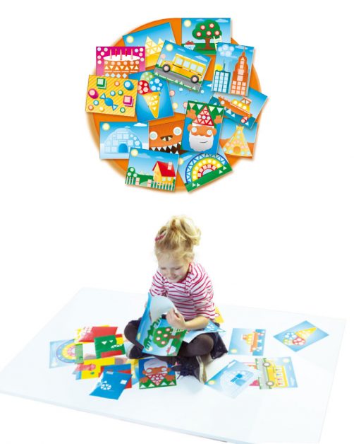 Recognising different shapes. What shape are the wheels of a bus? And the pyramid or the windows of a skyscraper? Look for the correct shape with the right colour and stick it on the sheets (see the dotted line). Soon you’ll start to see shapes everywhere around you.