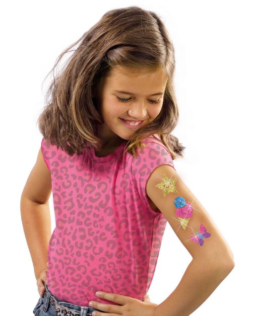 Make your own Fashion glitter tattoos with this set from SES Creative. Stick the double-sided transparent stickers onto your skin and dab the glitter onto the sticky part with the brush. Personalise your tattoos by experimenting with different colours of glitter or even try mixing the glitter. Cosmetically tested and easy to wash off skin.