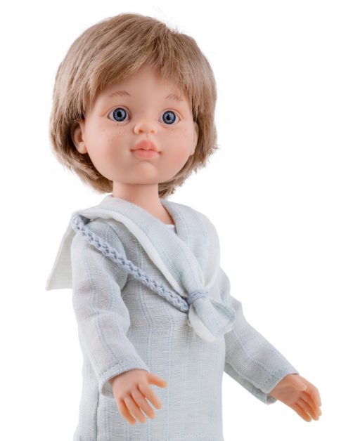 Luis is a 32cm vinyl doll. He has blond hair and gray eyes. He wears a traditional communion suit in white and gray tones.