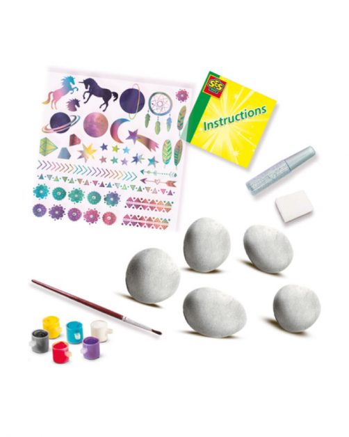 With cool rub-on stickers, glitter glue and six colours of paint, the five stones can be transformed into real galaxy stones! A rearing unicorn, planets or some feathers? Use creativity and choose your favourite rub on stickers. Rub them onto one of the painted stones and create unique combinations. And a layer of glitter glue will make the stones will look sparkly and magical.