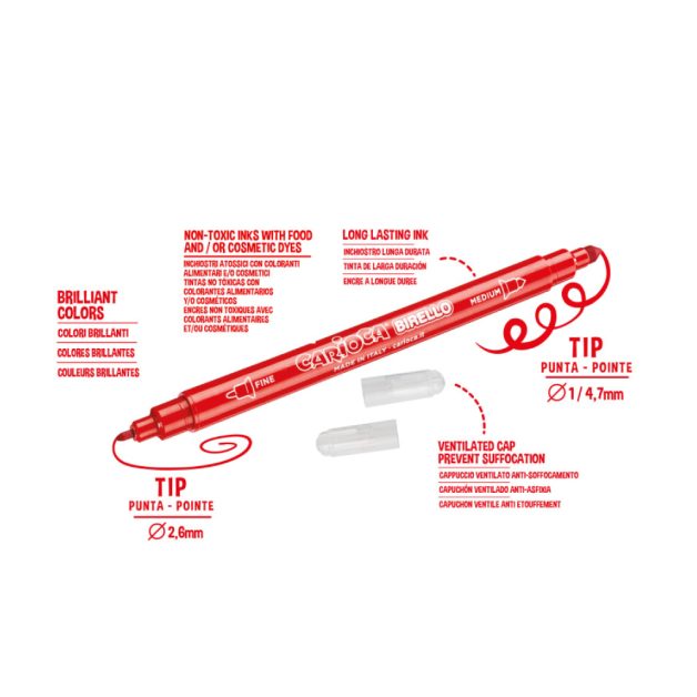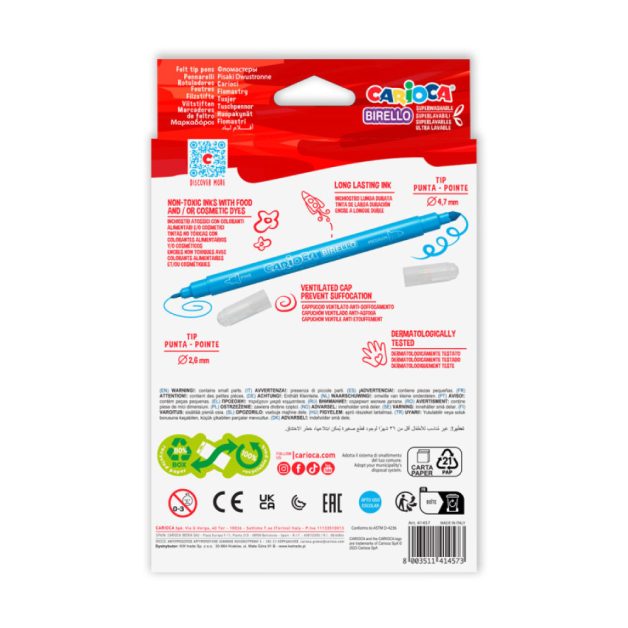 Ưu điểm vượt trội: Khác với nhiều loại bút dạ khác khó giặt sạch, CARIOCA Birello giúp bố mẹ yên tâm hơn khi bé sử dụng hằng ngày.