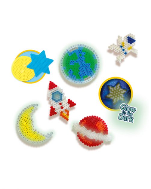 Với bộ đồ chơi hạt đậu thần kỳ Iron on beads – Glow in the dark Universe, bé có thể tạo ra những vì sao, hành tinh, tên lửa và nhà phi hành gia. Treo những tác phẩm này trong phòng ngủ, bé sẽ thấy hiệu ứng phát sáng thú vị.