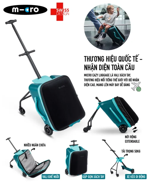 Micro Eazy Luggage là phát minh mới nhất đến từ thương hiệu Micro – Thuỵ Sĩ, vali kéo và đẩy có ghế ngồi dành cho bé. Sản phẩm phù hợp cho trẻ từ 2 tuổi trở lên và có thể tải trọng được 50kg. Vali giúp hỗ trợ trong những chuyến bay đường dài, quá cảnh tại các sân bay hoặc trong các khu du lịch rộng lớn. Micro Eazy Luggage không chỉ nhằm mục đích đựng đồ mà còn tích hợp ghế ngồi giúp các bé và ngay cả các bậc phụ huynh giảm bớt mệt mỏi trong việc di chuyển, mua sắm, và vẫn có thể mang theo số lượng đồ cần thiết.